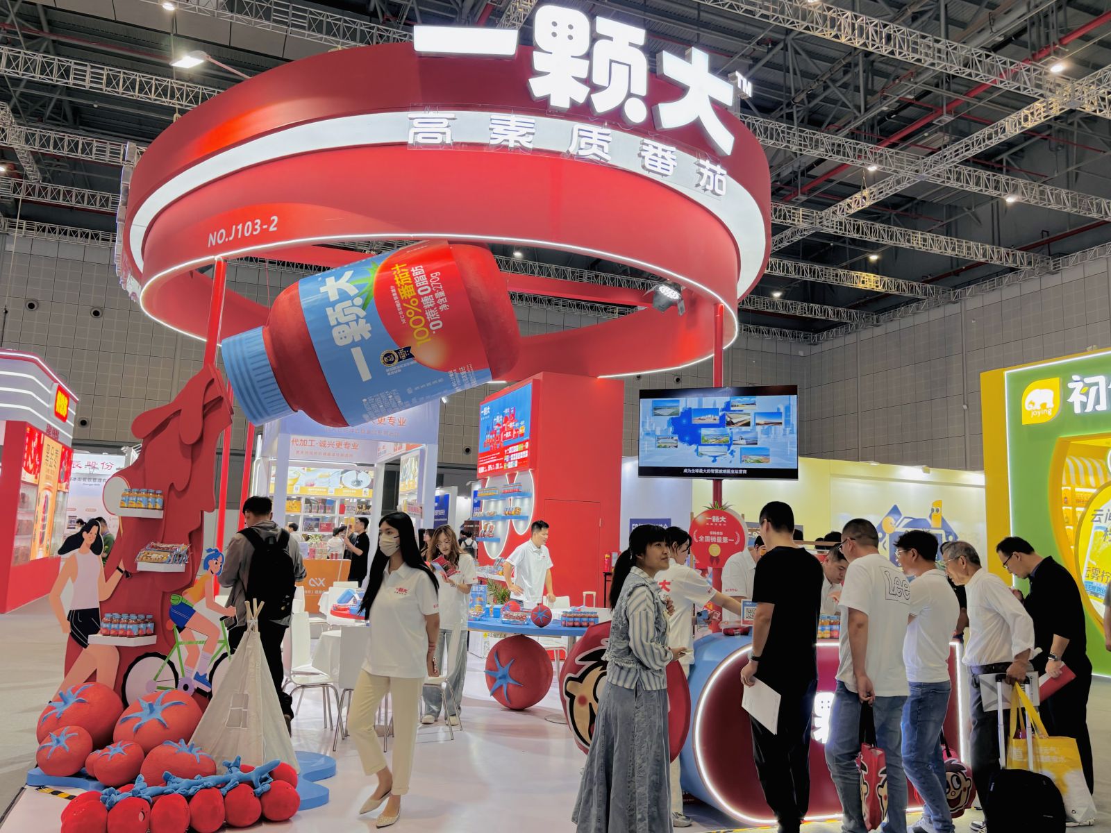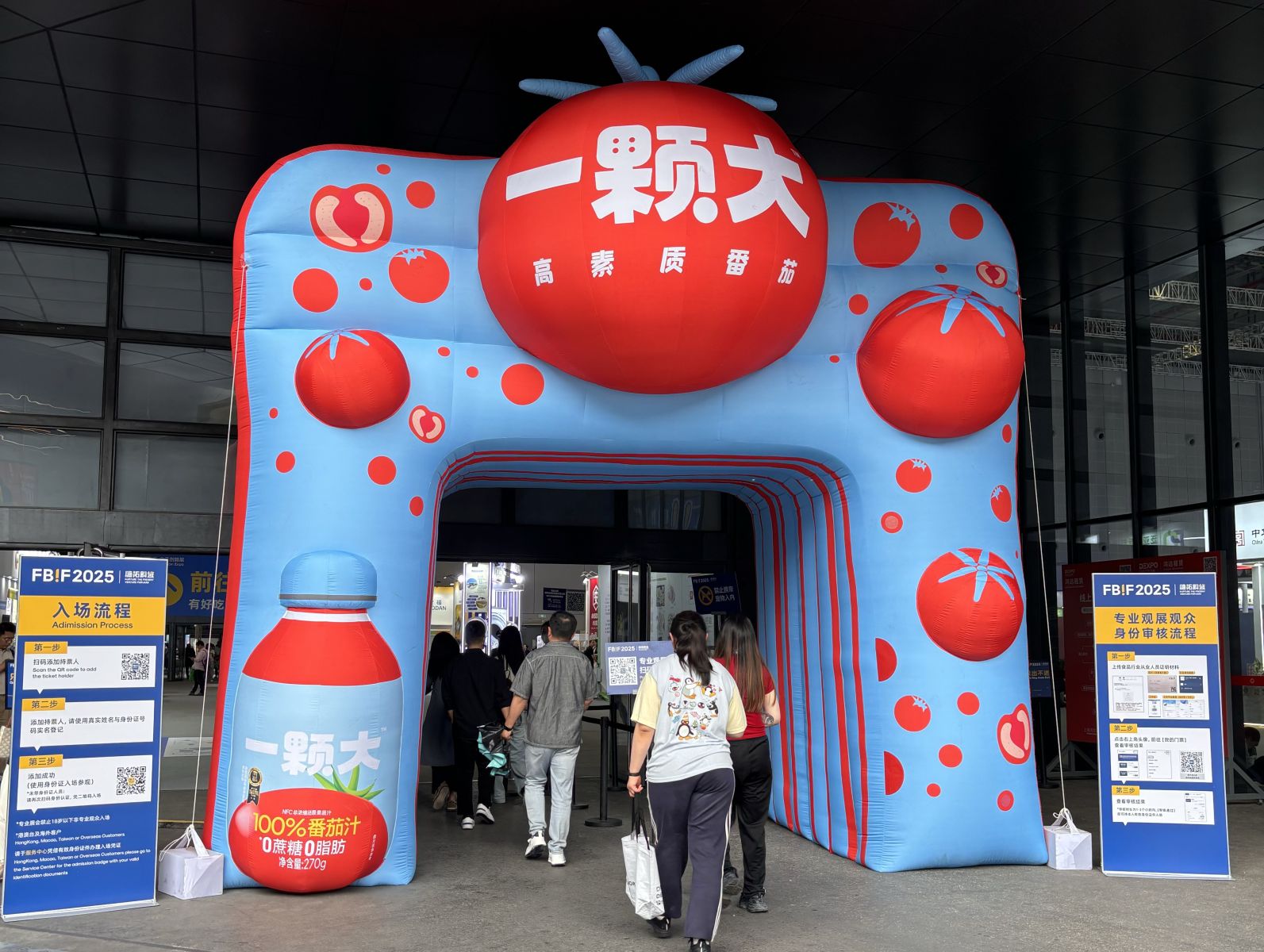 在本次FBIF食品创新展上,一颗大™再度带来新的惊喜。在展馆入口,一颗大™设置了生动活泼的巨型“番茄门”,红蓝撞色的品牌视觉以极具冲击力的呈现方式,为观众带来更多视觉体验。在一颗大™的展位上,100%NFC番茄汁大型装置、樱桃番茄大玩偶吸引了诸多观众驻足,现场打卡互动、了解产品与品牌。许多到场观众表示对一颗大™时尚、活力的品牌形象印象深刻。