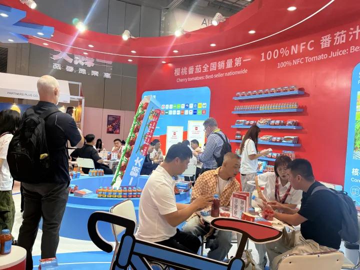 在一颗大™展台现场,樱桃番茄及100%NFC番茄汁同样成为关注焦点。据现场介绍,一颗大™樱桃番茄全部产自其所属公司凯盛浩丰集团自有智慧玻璃温室内,通过从种子到餐桌的全产业链数字化、标准化运营,一颗大™樱桃番茄不仅实现了0转基因、0人工激素、0重金属,且自然带种、多籽多汁、番茄味浓,收获了不少观展者好评,吸引了多个国家采购商深度洽谈。值得一提的是,现场备受赞誉的100%NFC红番茄汁使用的番茄原料也全部来自一颗大™自有产品,主打“配料只有番茄、不加一滴水”,收获了不少采购商问询。