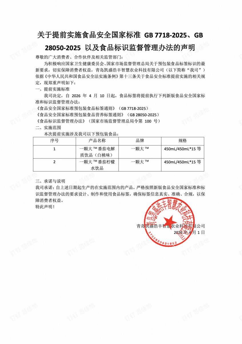 为积极响应国家卫生健康委员会、国家市场监督管理总局关于预包装食品标签标识的最新要求,切实保障消费者权益,青岛凯盛浩丰智慧农业科技有限公司(以下简称“我司”)依据《中华人民共和国食品安全法实施条例》第十三条关于食品安全标准提前实施的相关规定,现郑重声明如下: