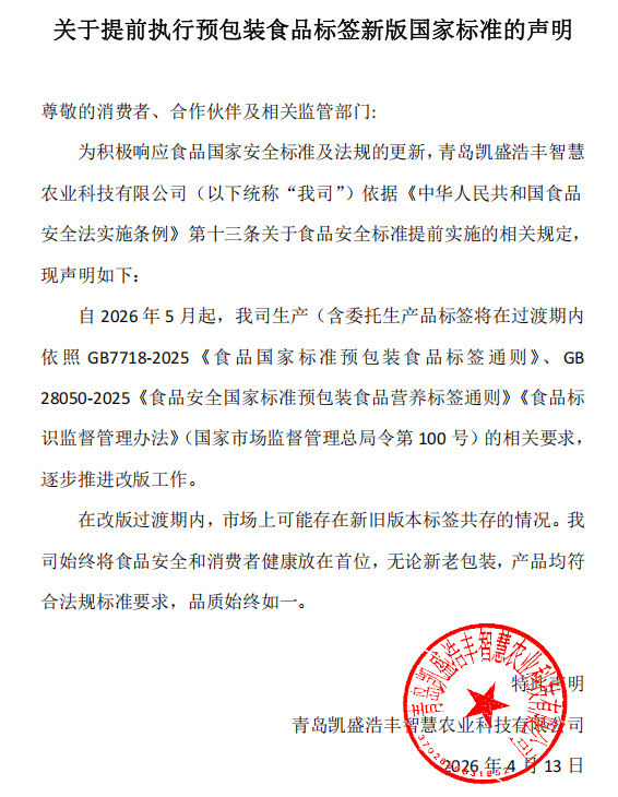为积极响应食品国家安全标准及法规的更新,青岛凯盛浩丰智慧农业科技有限公司(以下统称“我司”)依据《中华人民共和国食品安全法实施条例》第十三条关于食品安全标准提前实施的相关规定,现声明如下: